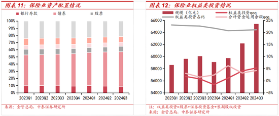 当前我国保险公司权益类配置占比提升空间充足,且资金运用规模基本稳定增长。对于权益类投资,2023Q1-2024Q3期间其规模稳步提升,在保险业(人身险公司+财产险公司,下同)合计资金运用余额中占比基本稳定在20%-23%之间,截至2024Q3规模/环比增速/占比分别达到65438.12亿元/5.26%/21.06%;其中,股票类资产投资占比保持在6.75%-7.86%之间,截至2024Q3为7.51%,占比保持低位。对于资金运用余额,2023Q1-2024Q3之间保险业合计资金运用余额保持环比小幅增长,2024Q1/Q2/Q3分别环比+6.20%/+3.19%/+4.21%。