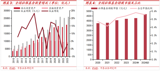 全国社保基金股票类配置仍有较大空间。截至2023年末,全国社会保障基金资产总额达到30145.61亿元,其中委托投资资产/直接投资资产规模分别为20738.58/9407.03亿元,分别占比68.79%/31.21%;权益总额达到25977.48元,近年来增速已逐渐放缓,2020/2021/2022/2023年同比增速分别为+16.14/+8.39%/-2.83%/+2.98%。在股票投资方面,2023年社保基金持仓市值为4213.96亿元,相比权益/资产口径下基金规模的25977.48/30145.61亿元仅占16.22%/13.98%,远低于财政部《全国社会保障基金境内投资管理办法(征求意见稿)》中设置的股票类资产40%的最大投资比例;截至2024Q3,全国社保基金持有股票648只,持仓市值达到4700.35亿元,仅占股市总市值的0.56%。