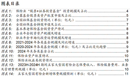 中长期资金现状:仍有较大入市空间。1.社保基金:截至2023年末,资产总额3.01万亿元,2024Q3持仓市值增至4700亿元,占比A股总市值仅0.56%。2.养老金:基本养老保险基金:2023年末投资资产1.86万亿元,权益类产品成立以来累计收益60.89%,但净值占比仅4.79%。企业年金:2024Q3规模3.49万亿元,同比+12.95%;职业年金:2023年末规模2.56万亿元,同比+21.33%。4、公募基金:2024年末总规模超32万亿元,权益类基金7.2万亿元(占比21.95%),2024年增速14.27%。5、保险资金:2024Q3权益类投资占比21.06%(股票类7.51%),资金运用余额31.1万亿元。