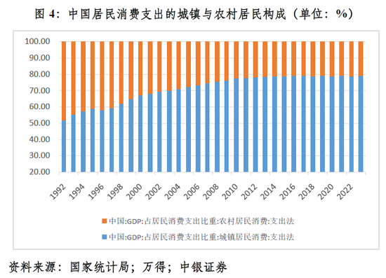 从居民消费支出的构成看,城镇居民消费不振是当前最终消费需求不足的主要原因。2020~2023年,城镇居民消费支出占比算术平均值为79.0%,较2015~2019年均值低了0.1个百分点;农村居民消费支出占比平均为21.0%,高出0.1个百分点(见图4)。