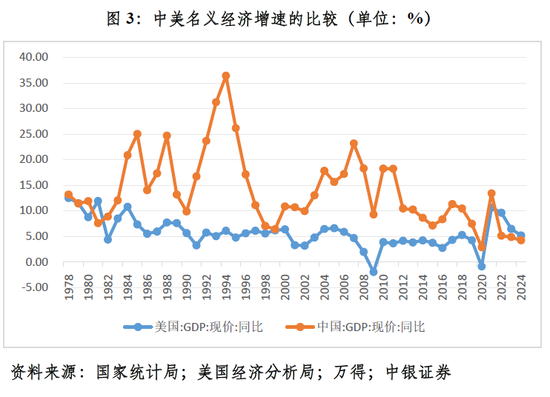 正因为中国经济尚处于负产出缺口,故实施更加积极有为的宏观政策,加强逆周期调节,当属对症下药。如果中国经济持续回升,推动实际增速回到潜在增速以上,由负产出缺口转为正产出缺口,则中国经济还将保持追赶态势。事实上,随着中美经济产出缺口的相向收敛,2022~2024年间,美国名义GDP增速领先中国的优势已经由4.67个百分点降至1.06个百分点(见图3)。