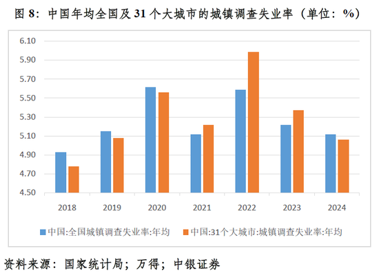 城镇调查失业率数据也显示,大城市就业总体难于中小城市,本地户籍人口就业总体难于外来农业户籍人口。中国就业统计自2018年起才有了城镇调查失业率数据,之前为登记失业率。2018和2019年,各年算术平均的31个大城市城镇调查失业率分别高于全国城镇调查失业率0.15和0.08个百分点;2020年仍高出0.06个百分点,但2021~2023年分别低了0.10、0.40和0.15个百分点,2024年重新高出0.06个百分点(见图8)。进一步分析细项数据,2022~2024年,各年算术平均的外来农业户籍人口调查失业率较本地户籍人口调查失业率分别高出0.20和低了0.33、0.58个百分点。前者就业形势好于后者,或因为前者是快递小哥、网约车司机等灵活就业的重要群体。