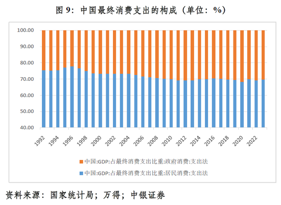 从最终消费支出的构成看,与前两次国际金融危机相比,政府消费(公共消费)的逆周期调节作用有待进一步发挥。2020~2023年,最终消费支出中,政府消费算术平均占比30.6%,较2015~2019年均值仅上升0.6个百分点。而1998~2002年,该项占比较1993~1997年均值上升2.73个百分点;2009~2013年,该项占比较2004~2008年均值上升2.24个百分点(见图9)。由此可见,前两次国际金融危机期间,中国实施积极的财政政策,不仅扩大政府投资,还刺激最终消费。当时,中国采取了提高公务员工资、鼓励家电下乡等政策举措。