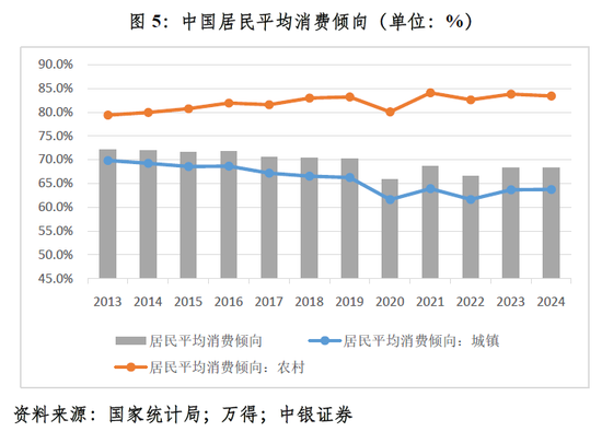 城镇居民消费支出占比下降是因为城镇居民平均消费倾向回落,而农村居民平均消费倾向稳中趋升。2020~2024年,全国居民平均消费倾向算术平均值为67.5%,较2015~2019年均值低了3.3个百分点。其中,城镇居民平均消费倾向均值为62.9%,低了4.5个百分点;农村居民平均消费倾向均值为82.8%,高出0.7个百分点(见图5)。