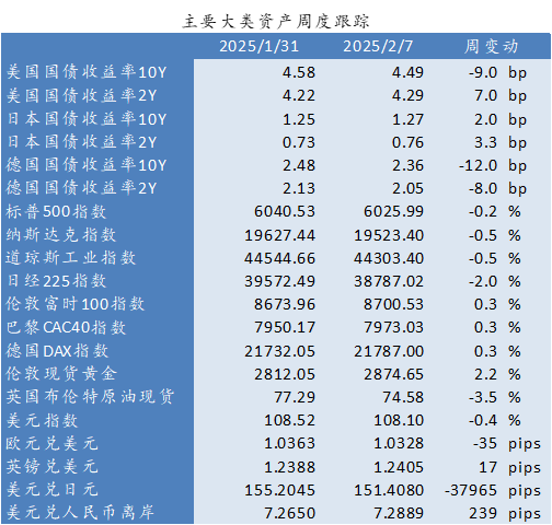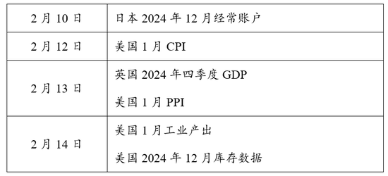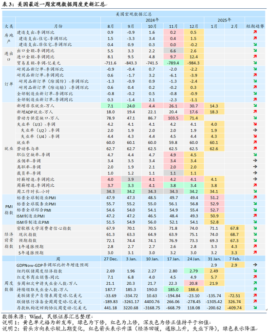 周度数据:亚特兰大联储2月7日更新的GDPNow预测数据显示,2025年一季度美国GDP预计季调年化环比增长2.9%(上周2.9%)。2月1日当周纽约联储周度经济指数(WEI)为+2.49%(前值由+2.84%下修至+2.79%),当周红皮书商业零售同比+5.7%(前值+4.9%),当周初领失业金21.9万人(前值由20.7万上修至20.8万),前周续领失业金188.6万人(前值由185.8万下修至185.0万)。2月5日美联储资产负债表较上周-72.51亿美元(前值-135.74亿),联储银行准备金周较上周+326.74亿美元(前值-1305.42亿),逆回购协议-409.74亿美元(前值-200.62亿)。