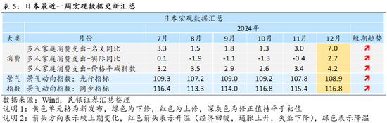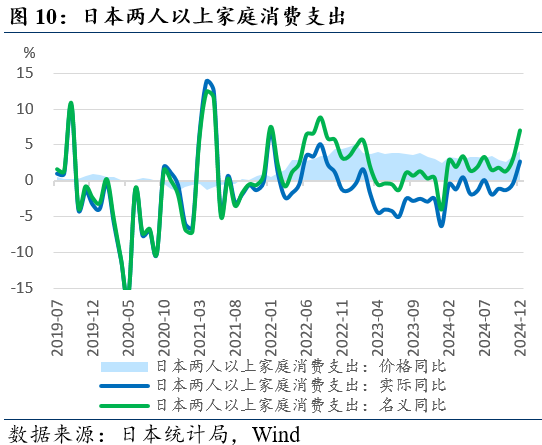 家庭消费同比明显加快,价格指数继续回升。2024年12月月日本两人以上家庭消费支出35.26万日元(前值29.55万日元),名义同比+7.0%(前值+3.0%),实际同比+2.7%(前值-0.4%),创28个月最高增速,价格因素同比+4.2%(前值+3.4%)。