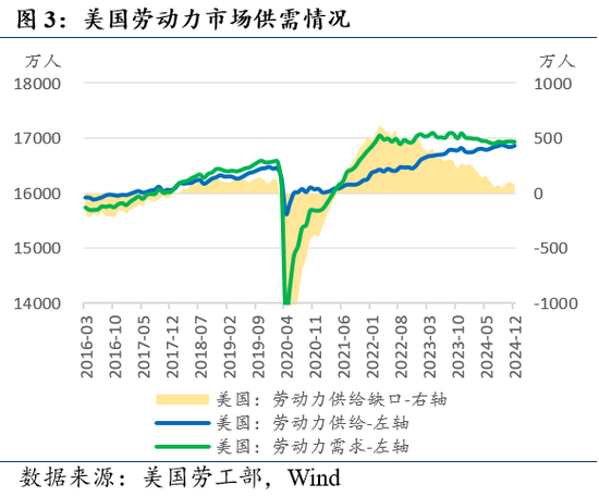 2024年12月职位空缺率与劳动力缺口均下降。12月季调后非农职位空缺数为760.0万人(预期800万人,前值由809.8万人上修至815.6万人),职位空缺率为4.5%(预期4.7%,前值4.9%)。经测算,12美国劳动力市场缺口为71.4万人(前值由97.7万人上修至103.5万人)。
