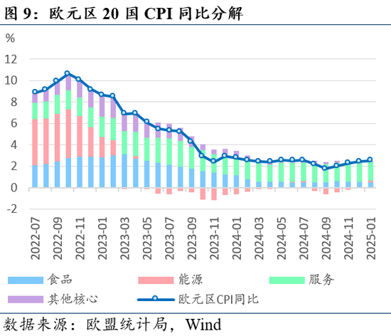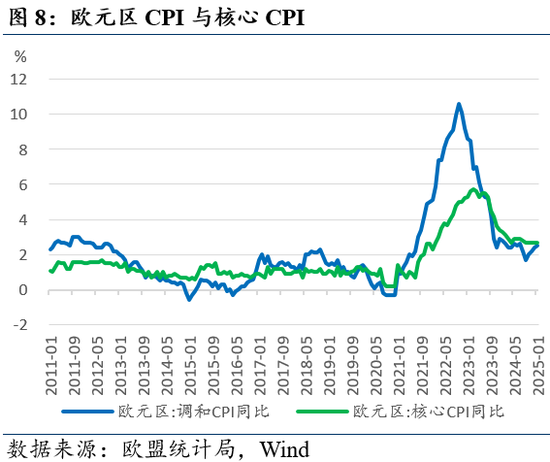 其他数据:PPI环比上涨同比持平,零售销售环比回落,德国贸易顺差扩大,法国、德国工业生产维持低迷。2024年12月欧元区PPI同比0.0%(前值-1.2%),环比+0.4%(前值+1.7);欧元区零售销售季调环比-0.2%(前值0.0%),同比+1.9%(前值+1.6%);德国12月出口季调同比+3.3%(前值-3.0%),进口季调同比+5.7%(前值-1.8%),季调贸易顺差207亿欧元(前值192亿)。法国12月工业生产指数季调环比-0.4%(前值+0.1%),德国季调环比-2.9%(前值+1.5%)。