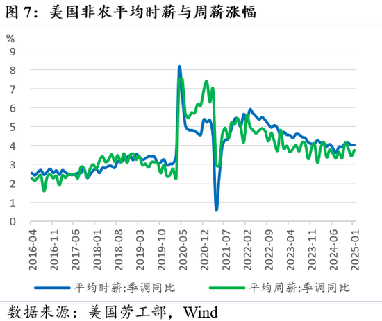 灾害对单月就业形成一定扰动但后续或回暖。单论1月新增非农就业,极寒天气和洛杉矶严重的山火侵扰也对数据形成较大扰动,仅休闲和酒店业就环比减少5.2万人,在灾害过去后有望回升。其他行业方面,关键的制造业增加0.3万人,好于全年12月的减少1.2万人,运输、金融和信息业表现下滑,但零售、教育和保健、其他服务业以及政府新增就业表现良好。