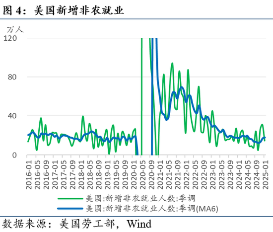 2025年1月非农数据略低于预期。1月美国新增非农就业14.3万人(预期17万人),12月由25.6万人上修至30.7万人,11月由21.2万人上修至26.1万人,新增非农就业6个月移动平均16.5万人(前值14.2万人)。12月ADP就业新增18.3万人(预期15万人,前值由12.2万人上修至17.6万人)。