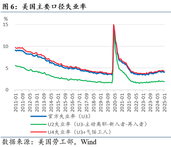 失业率连续第二个月下降。CES调查数据显示,1月美国U3失业率下行至4.01%,较去年12月的4.09%下降0.8pp,连续第二个月下行,优异表现超市场预期。从主要失业口径看,U2失业率1.89%,较12月下降0.04pp,其中永久性失业贡献1.00pp(前值1.01pp),暂时失业与完成临时工作贡献0.89pp(前值0.92pp),两者均出现好转。扩大到U3口径,主动辞职贡献0.53pp(前值0.56pp),新入和重回职场贡献1.63pp(前值1.59pp)。扩大到U4口径,气馁工人贡献0.3pp(前值0.3pp)。可见较为核心的U2失业率下行是各口径失业率下行的主要贡献。