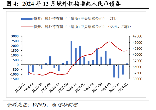 一是预计2025年1月份境外机构配置人民币资产规模减少20亿美元左右。随着一揽子稳股市工具出台及国内经济基本面向好,市场交易活跃,境外机构持续交易人民币资产,引发外储规模变动。对于债券的配置,受前期债市持续走牛影响,债市震荡回调,12月境外机构托管债券面额环比增加151亿元,折合20.7亿美元(见图4),但鉴于2025年1月国债收益率持续震荡上行,价格小幅回落,预计1月境外机构将减少增持债券。在股市投资方面,由于2025年1月份我国A股市场持续震荡,预计外资或小幅流出。结合债券与股市的走势情况,预计境外机构资产配置效应使2025年1月份外储减少20亿美元左右。