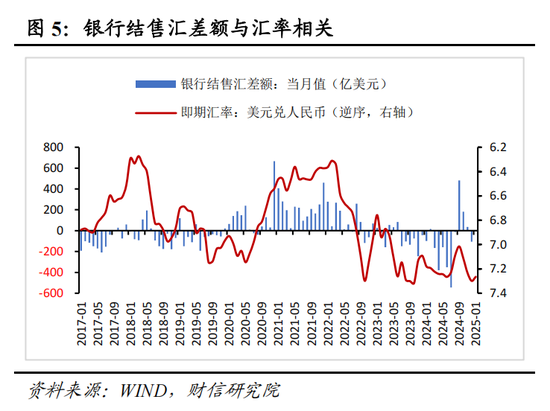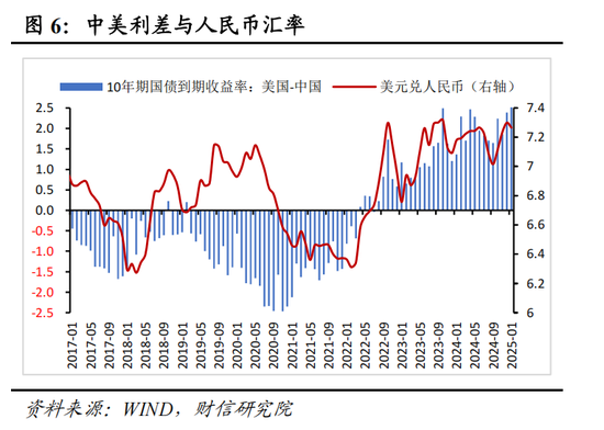 二是尽管人民币汇率贬值压力较大,但央行稳汇率决心较强,预计结售汇逆差在100亿美元左右。从短期看,影响我国企业和居民银行结售汇行为的原因,主要是美元兑人民币汇率的变化。通过比较美元兑人民币汇率与企业居民的银行结售汇差额的历史数据,整体上人民币升值趋势越明显,银行结售汇顺差越大(见图5)。在美国就业数据韧性较强和特朗普上台引发“再通胀”预期的共同作用下,美债利率继续走高,中美利差倒挂走阔(见图6),美元保持强势。但是,受特朗普上任后对华表述较为乐观影响, 2025年1月美元兑人民币汇率较2024年12月下降0.5%,与美元指数走势相悖,人民币面临较大的贬值压力,但鉴于央行稳汇率决心较强,我们预计2025年1月银行结售汇逆差或与上月持平,在100亿左右。