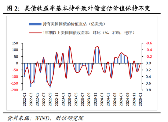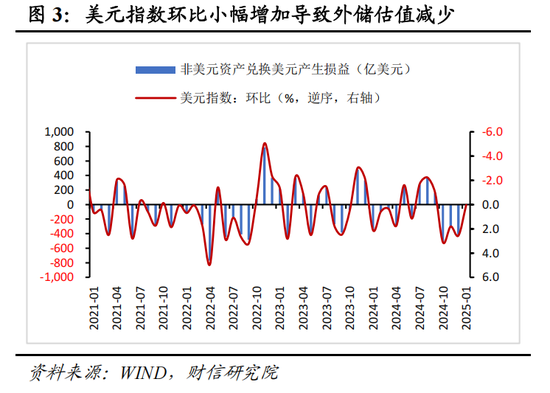 二是美元指数小幅上升,非美元货币相对美元贬值,汇率折算造成的汇兑损益约5亿美元。2024年12月末、2025年1月末美元指数分别为108.48和108.52,环比上升0.03%。通过估算,2025年1月份美元小幅升值导致非美元资产兑换为美元时产生汇兑损益约5亿美元左右(见图3)。