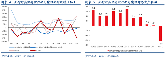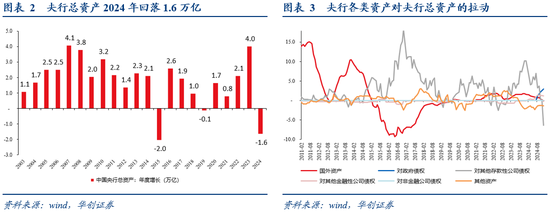 拆分央行资产负债表来看,2024年央行“缩表”的主因是减少了对商业银行的投放。数据来看,2024年央行总资产同比-3.6%。其中,对政府债权(对应央行购买的国债)对央行总资产的拉动为3%,对其他存款性公司债权(对应央行向商业银行投放的各类再贷款)对央行总资产的拉动为-6.4%,对其他金融性公司债权(对应央行对非商业银行的金融机构投放各类资金)对央行总资产的拉动为1.2%,其他资产(一些杂项科目)对央行总资产的拉动为-1.3%,其他科目(包含国外资产等)对央行总资产的拉动为-0.1%。