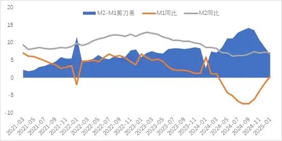 1月央行适度调控市场流动性,M2增速小幅下降,口径调整后的M1增速回正。M2同比增长7.0%,较上月下降0.3个百分点,央行总量型工具的操作相对克制。2025年1月开始,M1统计口径调整,加入了约41.4万亿元的活期存款与2.4万亿元的非银行支付机构客户备付金,M1规模上升至112.45万亿元,M1同比增速回正至0.4%。M1增速回升不单单是口径调整所带来的,1月企业短期信贷增长较快,企业短期存款增加也推升了M1。M2-M1增速剪刀差再度收窄2.1个百分点至6.6个百分点,市场信心与增长预期逐步修复。
