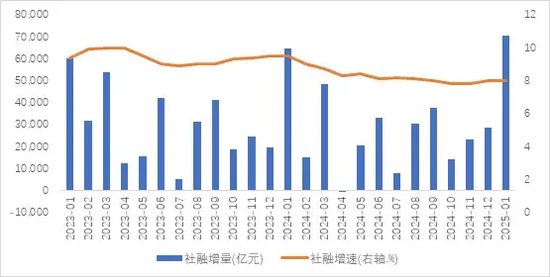 更加积极的财政政策前置发力,政府债券发行明显高于往年。1月政府债券增量6933亿元,同比多增3986亿元。财政部已经明确表示,2025年赤字规模将有较大提升,具体数值需要履行法定程序之后才能公布。全年政府债券发行计划包括一般国债及超长期特别国债、地方政府一般债券与专项债券以及用于置换地方隐债的特殊再融资专项债券等。地方专项债的投向领域也在持续优化,并扩展至收购限制土地储备、收购商品房用作保障房等,投向领域实行“负面清单”管理,用作项目资本金范围方面实行“正面清单”管理,对相关产业的拉动作用将逐步上升。2025年需要发行的政府债券种类较多、发行任务较重,各级政府将债券发行前置以达成全年发行目标,尽早发行、尽早使用、尽早产生实际效果,预计政府债券融资将持续成为社融增长的主要推动力。