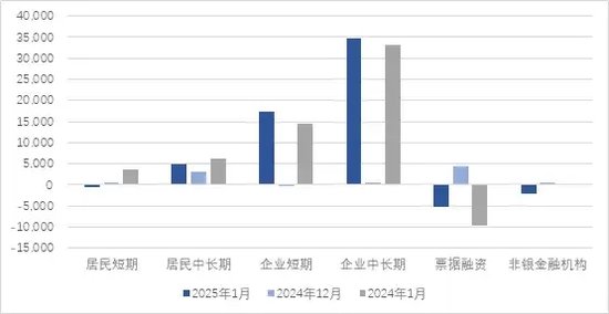 企业资金需求明显上升,中长期信贷增加。1月企业信贷新增4.78万亿元,同比多增9200亿元,其中短期信贷新增1.74万亿元,同比多增2800亿元;中长期信贷新增3.46万亿元,同比多增1500亿元。从短期信贷来看,春节前企业应付款结算、工资、奖金等过节资金需求较大,同时债务置换资金、项目启动资金等也有较为明显的增加。从中长期信贷来看,商业银行2025年“开门红”所储备的增量信贷大部分以基建、制造业中长期贷款为主,多为长期资金。值得注意的是,1月票据融资减少5149亿元,低于去年1月下降规模,可以看出实体经济信贷需求较强,这也受益于贷款利率的持续下行。综合来看,企业扩大生产与投资信心正逐步改善。
