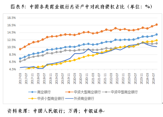 自2021年第三季度10年期国债收益率跌破3%以来到2024年第三季度,银行净息差同不良贷款比例的缺口与银行总资产中对政府债权的占比为强负相关,相关系数为-0.889。这表明净息差与不良贷款比例的倒挂程度越深,商业银行对政府债权的配置占比越高。同期,商业银行总资产中对政府债权占比上升了2.6个百分点。其中,中资大型、中型和小型银行分别上升了2.2、1.7和3.7个百分点,外资银行上升了1.7个百分点,显示中资小型银行升幅最大(见图表5)。