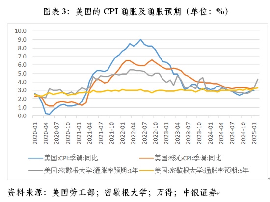 首先,特朗普广泛的关税政策、减税及限制移民或使美联储实现通胀目标变得复杂。1月份美国CPI通胀数据全面反弹,以及2月份密歇根大学通胀预期环比跳升,均敲响了警钟(见图表3)。2月12日,美国CPI通胀报告公布后,交易员将下次美联储降息时间从9月延至12月。当日,美联储主席鲍威尔表示,评论国会或政府制定的政策是否明智不是美联储的职责,但新政策可能促使美联储改变利率。