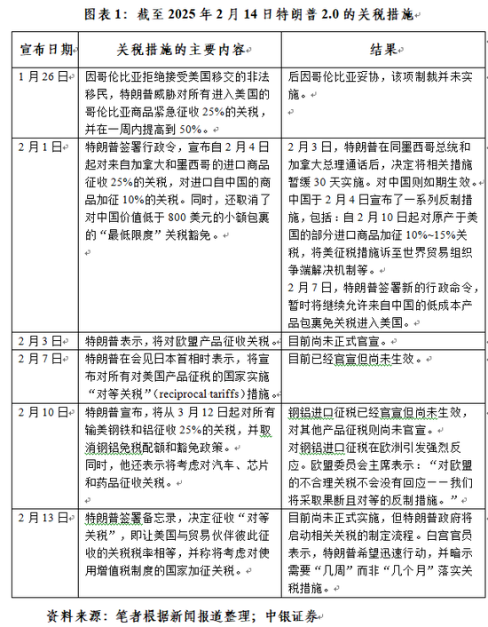特朗普1月20日正式入主白宫,开始了他的第二个任期(下称“特朗普2.0”)。他就职不到一个月时间,就紧锣密鼓地兑现其竞选承诺,打响了关税第一枪(见图表1)。