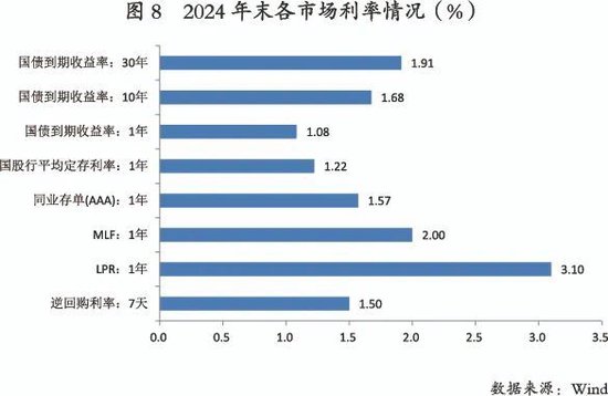 基于以上情况,2024年以来我国货币政策框架的深度调整已逐步展开,人民银行实施一系列举措,切实推进货币政策框架向价格型转变。目前,我国基本形成以7天逆回购为主要政策利率,DR007为货币市场基准利率,国债利率为债券市场基准利率,LPR为贷款市场基准利率的货币政策框架,并通过利率走廊、正逆回购、国债买卖等公开市场操作强化政策利率的货币政策立场,通过整治手工补息、加强同业存款定价管理、减弱MLF的货币投放功能、灵活化按揭利率加点和重定价机制等举措加强由短及长的利率传导效果。