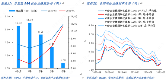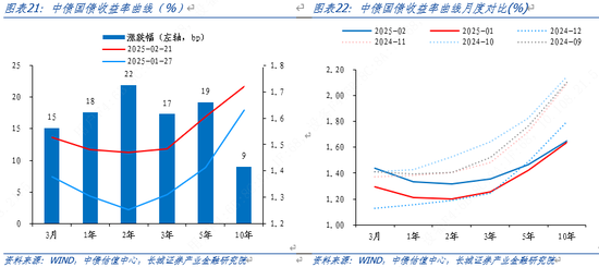 1月27日至2月21日,中债国债收益率曲线平坦化上移,各期限收益率均有显著上行,短端幅度更大。10年期国债收益率自4季度中后期开启极端下行行情,走势与去年类似但时间前置,一度陷入抢跑与内卷的螺旋效应,短时间内频频创下新低。元旦后10年期国债收益率逐渐走到多空博弈点,在1.60%-1.65%区间内反复磨底。当时资金市场已经出现阶段性短缺,银行间资金利率中枢抬升,短端市场利率应声回调,并由短端向长端传导,1-2月收益率曲线整体平坦化上行,且短端上升幅度多于长端。跨年期间10年债延续偏强,直到春节后转入震荡调整区间,现在逐步回调至1.7%以上。