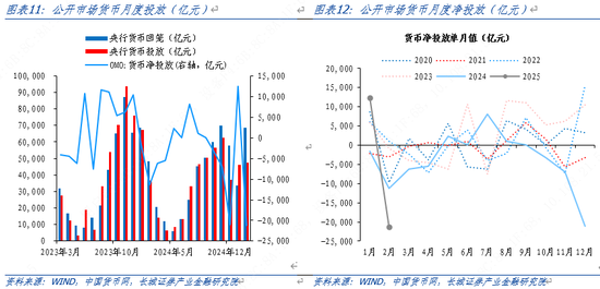 2月央行通过公开市场操作共投放货币47276亿元,回笼货币68531亿元,回笼大于投放,净投放量为-21255亿元(1月净投放为12433亿元),2024年4季度以来央行资金面较为宽松,节后开始转向收紧,且2月单月货币净投放明显低于往年同期。