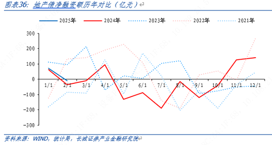 地产融资方面,截至2月21日,2月地产债总发行量为249.81亿元,同、环比均有减少(去年同期为294.41元,前一月为485.72亿元);总偿还量为258.52亿元,净融资由正转负,降至-8.71亿元,前值70.31亿元,地产融资发行与偿还均在收缩,净融资额自12月以来持续减少。