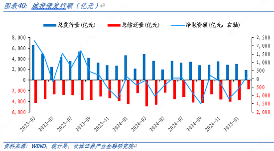2月份,城投债总发行量为1892.50亿元,环比缩减38.4%,略低于去年同期(2125.2亿元),总偿还量为1724.73亿元,发行与偿还量均有收缩;净融资额自11月连续增长,2月由负转正收于167.76亿元(1月为-657.02亿元),去年一年净融资额多数处于负区间。化债进程之下,城投债净融资预期将在低位徘徊,可能不会有大幅增长。