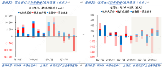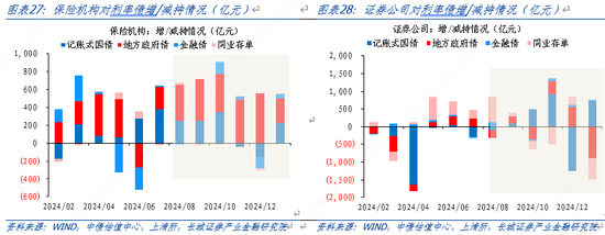 根据日前公布的2025年1月机构持有利率债的情况来看(2025年2月尚未公布),信用社、保险机构在继续增持利率债,商业银行、证券公司均有大规模减持情况。分机构具体情况来看,商业银行1月明显减持地方政府债(减持金额超1万亿元)、增持同业存单;信用社和保险机构对各类别利率债均有增持,其中信用社主要增持同业存单和国债,保险机构增持以国债地方债为主;证券公司主要增持国债,减持地方债和同业存单。