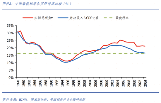 对于一般财政预算收支,最优税率为16.19%,与美国联邦政府测算结果相近。改革开放前十年,实际宏观税负高于最优税率,但经济改革不断降低了宏观税负;1991年到2001实际宏观税负低于最优税率,促使分税制改革启动;2002年之后宏观税负不断上升,2015年见顶之后回落,但还高于最优税率。不过若以财政收入占GDP比重来看,目前已经达到最优税率水平。