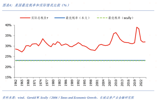 Scully(1995)测算1949-1989年美国的经济增速最大化税率在21.5%-22.9%之间,Scully(2003)运用Barro模型和其自己模型测算结果分别为25.1%和19.3%,Scully(2006)再次测算1929-2004年的美国经济增速最大化税率为23%。本文测算的结果是23.12%,几乎与Scully(2006)测算的结果一致。