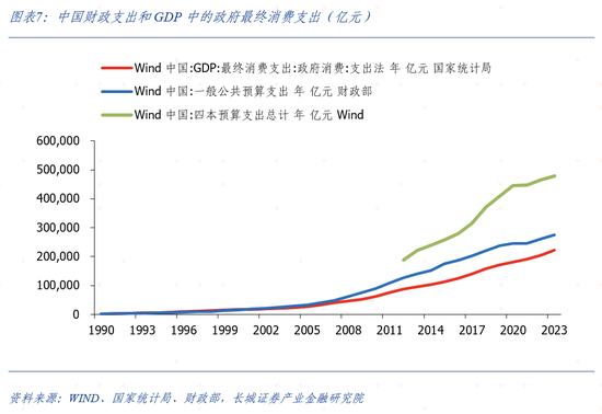我们在《中国的“李嘉图等价”是否成立?》中已经分析,公共财政支出基本上分为政府消费性支出和政府投资性支出,政府投资性支出的95%被计入国有资产投资中。四本帐中除公共财政支出的部分大多是政府补贴、社会福利以及资本转移等形式出现,我们认为这些可以归类为转移支付。所以公共财政支出可以作为政府支出的替代指标。