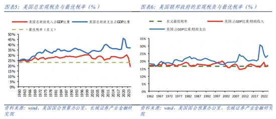 如果我们将最优税率与名义财政总收入占GDP比重和名义财政总支出占GDP比重相比较,可以发现美国的宏观税负明显高于最优水平。无论是实际的财政收入还是财政支出,都远远高于最优的税率水平,由此看来美国政府缩减政府开支和减税是最优选择。