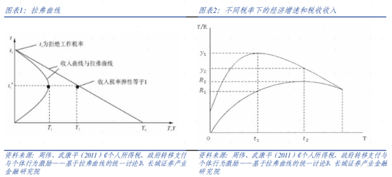 实际上大多数税收收入函数并非线性函数,在税收最大化之前,随着税率提高,经济产出增速会逐渐提高到最高点,然后不断下降,即g的最高点会在税收之前,如图表2。也就是说在税收最大化之前经济增速可以先实现最大化,而这就提出了新的政策目标:最优税率。