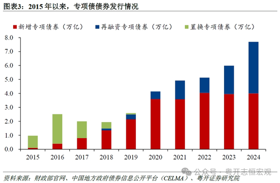 以2024年为例,地方政府专项债券累计发行7.7万亿元。其中,新增专项债券发行4.0万亿元,再融资专项债券发行3.7万亿元。再融资债券占比为48.1%,较2023年上升14.1个百分点,创2015年专项债券发行以来的新高。从具体用途来看,2024年用于项目建设的专项债占比为40.5%,用于偿还到期专项债券的占比为19.2%,用于化债的专项债发行规模达到3.1万亿元,占比为40.4%。