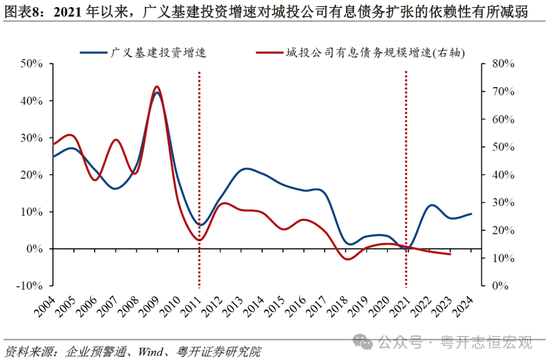 一是扩大有效投资对冲经济下行压力,有效发挥逆周期调节作用。专项债作为一种重要的财政政策工具,通过发行债券筹集资金,用于基础设施建设和社会事业发展等领域,成为逆周期调节的重要手段,促投资、稳增长,为长期经济发展奠定了坚实基础。从基建投资来看,过去城投公司作为地方政府投融资的主要抓手,通过银行贷款、城投债、非标等债务融资手段为地方政府投资提供资金。因此从数据上看,过去基建投资周期与城投公司债务扩张周期表现出高度的同步性,但近年来这一关系有所弱化。这是由于自2019年以来,专项债新增额度不断扩大,吸引带动社会资本投向专项债项目,逐渐发挥出扩大有效投资的积极作用,对冲了城投债务扩张放缓对基建投资形成的压制。2019-2024年,新增专项债额度分别为2.15、3.75、3.65、3.65、3.8、3.9万亿元;新增专项债带动的项目投资规模逐年攀升,2019-2024年专项债累计投资项目12.9万个、项目总投资额158.2万亿元。