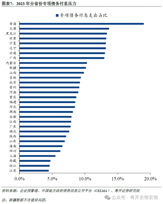 五是专项债务余额上升叠加土地出让收入下滑,专项债务付息压力较大。从分省份专项债务付息支出占政府性基金预算支出比重来看,2023年全国有10个省份专项债务付息支出占比高于10%,分别为青海、天津、黑龙江、甘肃、宁夏、辽宁、云南、广西、内蒙古和新疆。