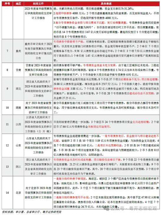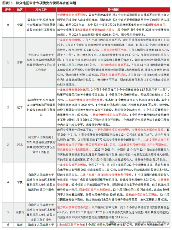 五是项目申报过程中重数量、轻质量。由于专项债的偿还期限较长,部分地区在专项债额度申报时忽略未来偿债能力,存在“多报多得”的侥幸心理。为了争取更多的新增专项债限额,各地在申报环节盲目追求项目数量与规模,项目存在“临时拼凑”现象,而忽略了项目质量,导致专项债项目先天不足。其一,前期准备工作不充分。部分地方仓促申报专项债券额度,项目勘察、设计、用地、环评、开工许可、可研报告等前期工作不够充分,项目在实际操作过程中面临各种问题,实操性不足,导致项目推进缓慢,债券发行后“钱等项目”,降低了债券资金的使用效率。例如,吉林、辽宁、海南等省份在审计中发现均存在因招投标、建设工程规划许可手续等前期准备不充分,导致项目推进缓慢的现象。其二,虚增收入“包装”项目。专项债项目前期需要提交《项目收益与融资自求平衡专项评价报告》,对投资、收益、成本、本息覆盖倍数进行测算。实际操作过程中,为了提高专项债项目审核通过的概率,专项债项目收入、成本预测缺乏可行性论证和尽职调查,部分数据甚至是中介机构“人造”的,为未来专项债本息偿还留下隐患。例如,宁夏审计发现5个项目通过虚报项目收入等将项目“包装”成收益与融资规模平衡的项目,借此发行专项债券3.95亿元。其三,虚构项目。部分地方为了做大项目库,将已完工或不符合规定的项目纳入项目清单。审计署审计发现2023年522个缺乏要素保障甚至已停工的项目被纳入项目库。