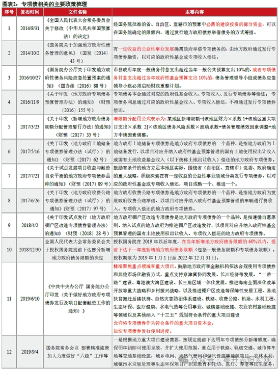 二是扩大专项债使用范围。2019年6月,中共中央办公厅、国务院办公厅印发《关于做好地方政府专项债券发行及项目配套融资工作的通知》,明确专项债重点支持京津冀协同发展、长江经济带发展等重大战略,保障性安居工程等领域以及其他符合条件的重大项目建设。2019年9月,国务院常务会议首次提出了专项债重点用于交通基础设施、能源、农林水利、生态环保、民生服务、冷链物流设施、市政和产业园区基础设施7大领域,同时明确专项债资金不得用于土地储备和房地产相关领域。2021年9月,财政部办公厅、国家发改委办公厅联合发布《关于申报2022年新增专项债券项目资金需求的通知》,明确2022年新增专项债券资金投向领域增加国家重大战略项目、保障性安居工程至9大领域。随后在2022年5月,国务院印发关于《扎实稳住经济一揽子政策措施》的通知,强调在前期确定的交通基础设施、能源、保障性安居工程等9大领域基础上,适当扩大专项债券支持领域,优先考虑将新型基础设施、新能源项目等纳入支持范围,国家发改委将“新能源”并入原有能源领域,增加“新型基础设施”领域,其他领域分项也进行了调整和完善。至此,专项债券投向领域拓展至“十大领域”。
