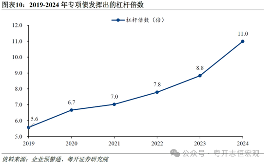 四是撬动社会资本投资,形成多元化投资的格局。专项债作为政府投资的重要形式,通过吸引更多的社会资本参与,发挥出政府债券“四两拨千斤”的作用。专项债除了作为债务性投资外,还可以作为重大项目资本金,更好地发挥专项债的撬动作用。以(项目总投资额/专项债资金投入)衡量,专项债的撬动作用逐渐增强,杠杆倍数逐年扩大,从2019年的5.6倍稳步上升至2024年11.0倍。