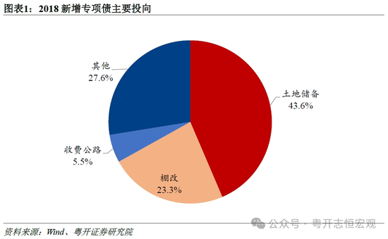同时2017年下半年,专项债开始试点中国版“市政项目收益债”,先后推出土地储备、收费公路、棚改三大标准化地方政府专项债。2017年7月,财政部印发《关于试点发展项目收益与融资自求平衡的地方政府专项债券品种的通知》,鼓励地方政府积极探索在有一定收益的公益性事业领域分类发行专项债券,打造中国版的地方政府“市政项目收益债”。2017年6月和7月财政部先后联合原国土资源部和交通运输部印发《地方政府土地储备专项债券管理办法(试行)》和《地方政府收费公路专项债券管理办法(试行)〉的通知》,当年土地储备和收费公路专项债分别发行2407和 440亿元,占当年新增专项债发行规模的比重分别为30.3%和5.5%。2018年4月,财政部联合住房城乡建设部印发《试点发行地方政府棚户区改造专项债券管理办法》,推出棚改专项债债券。2018年土地储备、棚改、收费公路专项债分别发行5893、3102和750亿元,占当年新增专项债发行量的43.6%、23.3%和5.5%,三者合计占比达到72.4%。