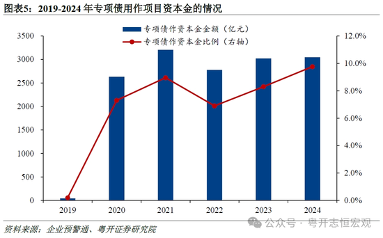 三是专项债用作项目资本金规模呈上升趋势,占比提高,2024年达到9.8%,距离30%的政策上限仍有较大提升空间。