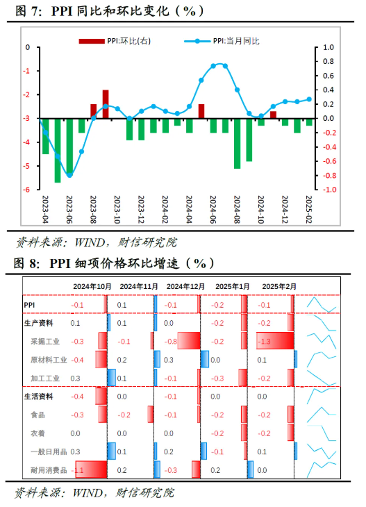 四、预计3月份PPI降幅维持在-2.2%左右,全年延续负增格局概率偏大。一是3月份PPI翘尾因素较2月份提高0.1个百分点;二是受特朗普意图增加传统能源供给、美国近期经济指标不及预期等因素影响,短期国际油价仍面临一定下行压力;三是随着一揽子刺激政策进一步见效,加上年初各地奋战“开门红”,国内工业品价格有望温和回升。