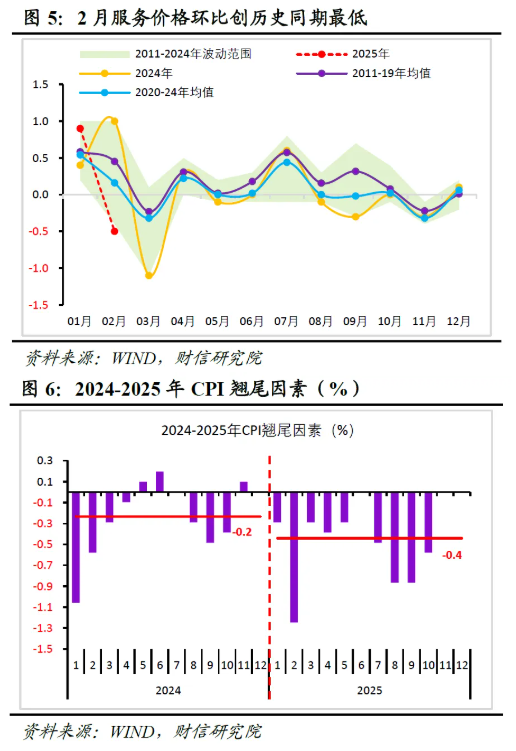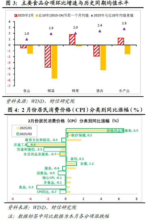 一、春节错月和服务需求偏弱共致CPI超预期回落,食品环比回落幅度并未超出历史同期均值。2月份CPI同比回落1.2个百分点至-0.7%,其中,食品和非食品的拉动作用分别较上月回落0.7和0.5个百分点,春节错月导致基数走高叠加节后需求下降是回落主因。但从环比增速看,2月份食品价格环比高于2015-24年节后一个月均值水平1.0个百分点,食品并非CPI超预期回落的主因;服务价格同比下降0.4%,2021年3月以来首次转负,环比下降0.5%,为历年2月份的最低值,均表明服务价格是CPI超预期回落的主因,这也导致核心CPI同比时隔4年再次转负,居民消费不振问题凸显。