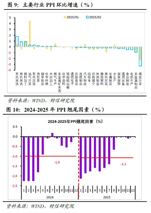 预计3月份PPI降幅维持在-2.2%左右。一是3月份PPI翘尾因素在-1.8%左右(见图10),较2月份提高0.1个百分点;二是受特朗普意图增加传统能源供给、美国经济指标不及预期等因素影响,短期国际原油价格面临一定的下行压力;三是随着一揽子刺激政策进一步见效,加上年初各地奋战“开门红”,未来国内工业品价格有望温和回升,但房地产低迷和经济供强需弱制约短期难改。