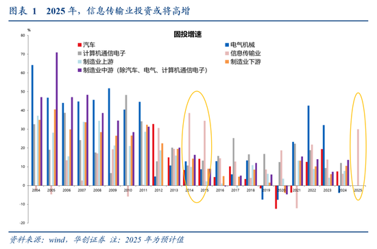 从细分行业看,投资或集中体现在信息传输、软件和信息技术服务业中,一方面,核心企业如腾讯、三大运营商均隶属于该行业,另一方面,相关产业链(如IDC、云计算、光模块等)也多属于这一范畴。类似于2014-2015年因4G建设而导致信息传输业投资高增,2025年,受到AI投资带动,信息传输业投资或将再度“鹤立鸡群”。
