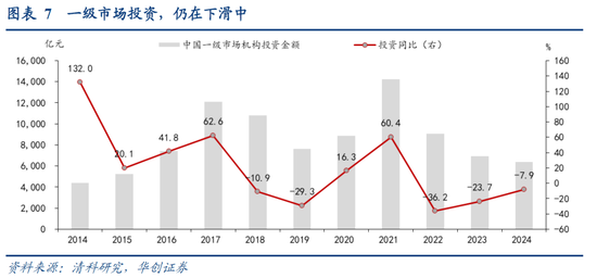 当前一级市场投资仍偏冷,投资额连续4年下滑。据清华大学私募股权研究院数据,2024年,中国股权投资(含早期/VC/PE)市场投资总额为6381亿元、同比下滑7.9%,为2021年来连续第四年下滑。主要科技行业中,IT投资逆势高增,2024年投资额915亿元、同比大增30.5%;但半导体及电子设备下滑,2024年投资额1333亿元,但同比下滑28.5%。