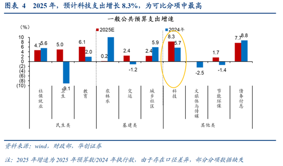 2)财政,参照第一本账中的科技支出,预计2025支出1.24万亿,增量为959亿元、增速为可比分项中最高;